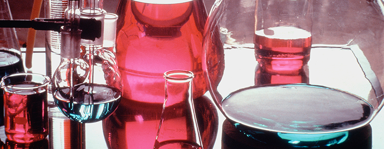 A lab scene with test tubes and a glass vial, representing biotechnology's role in enhancing quality in beauty products