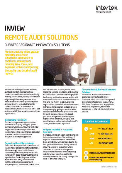 Remote auditing offers greater flexibility and a more sustainable alternative to traditional assessments, reducing time, travel, and expenses while also improving the quality and detail of audit reports. Intertek Inview is a remote audit solution to help organizations conduct more efficient and safer audits.